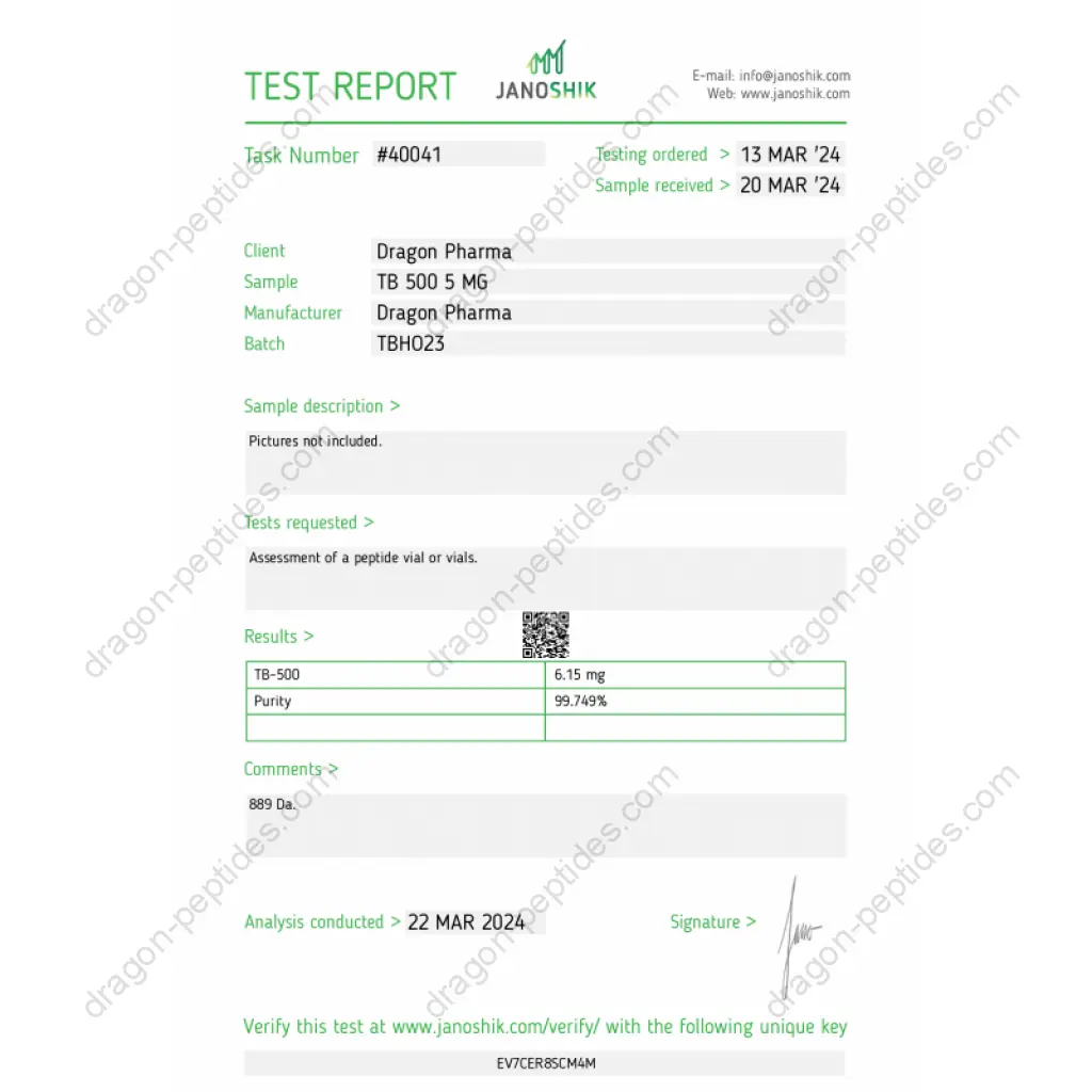 Dragon TB-500 (Thymosin Beta-4) is a peptide consisting of a sequence of 43 amino acids. Research in animal models has demonstrated that TB 500 peptide can promote blood vessel growth, modulate wound healing processes, reduce inflammation, and mitigate oxidative damage, particularly in the heart and central nervous system.